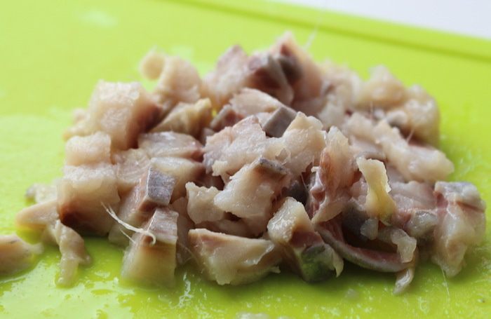 Селедку нарезать мелкими кусочками.