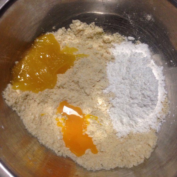 Теперь в получившееся тесто засыпаем сахарную пудру, мед и желток, все перемешиваем, тесто получается очень крутое и гладкое, если слишком жидкое тесто, то добавьте муки, а если рассыпается, то немного меда.