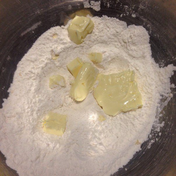 Холодное сливочное масло порезать на маленькие кусочки и закинуть в муку, и руками быстро растереть масло с мукой, чтобы оно не начало таять — делаем все быстро!