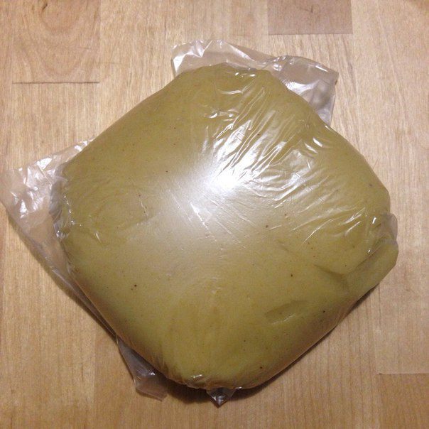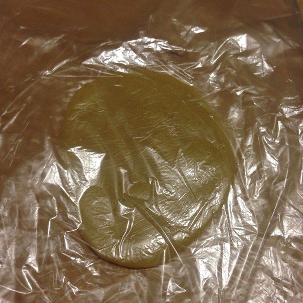 Из теста делаем шарик и кладем его в пленку и в холодильник на 1 час.