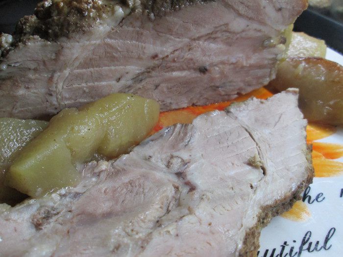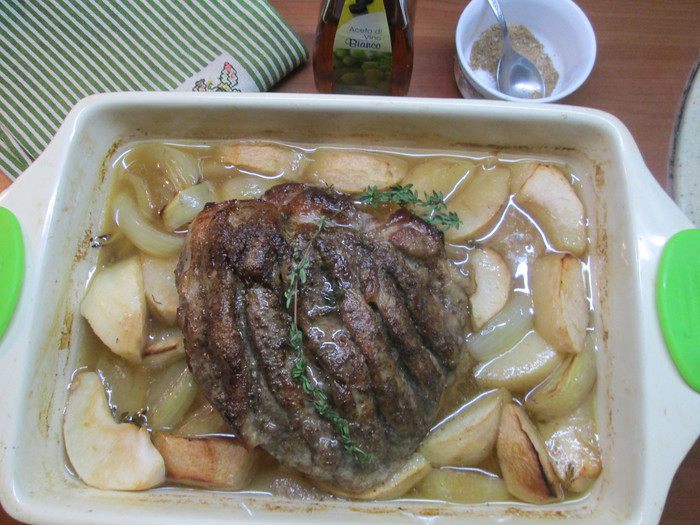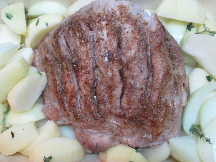 В сотейнике обжариваем мясо до золотистого цвета. Выкладываем в форму для запекания, добавляем яблоки, лук, тимьян и лавровый лист. Далее нужно влить сок и бульон. Готовить в форме, с закрытой крышкой при 160-170°С 2,5 часа. Далее снять крышку и готовить еще 30 минут при 180°С.