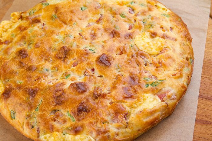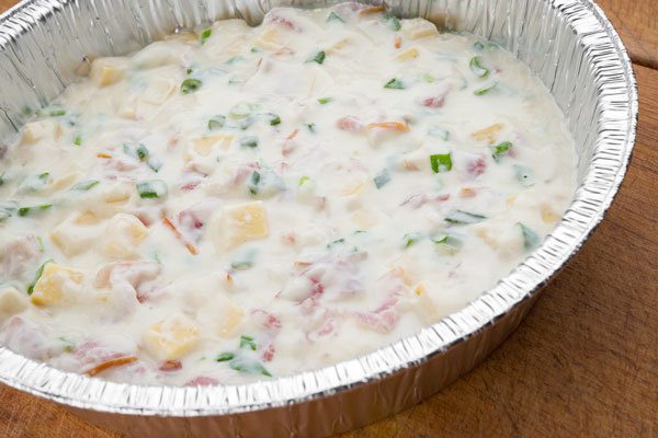 Духовку разогреть до 200°С. Влить молочно-яичную смесь, еще раз все тщательно перемешать. Форму для выпечки смазать маслом (если нужно) и вылить туда тесто. Выпекать 20-30 минут.