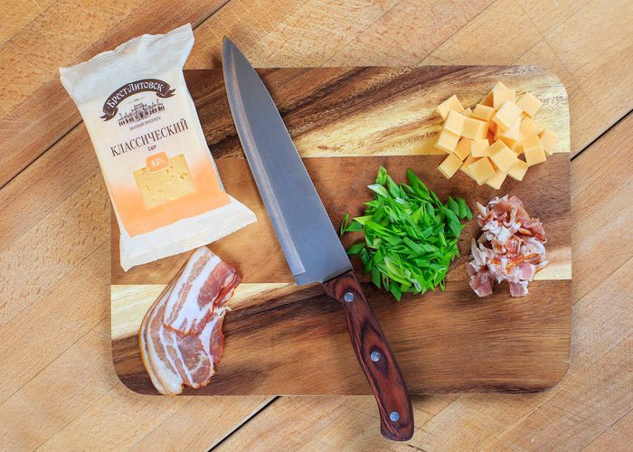 Сыр и грудинку нарезать крупными кубиками. Зеленый лук вымыть, просушить и нарезать.