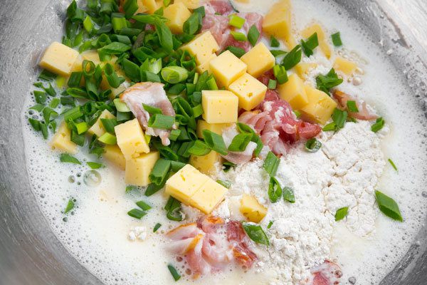 Муку просеять вместе с разрыхлителем. Добавить нарезанную грудинку, сыр и лук. Тщательно перемешать. С сыром "Брест-Литовск" пирог получится очень аппетитным!