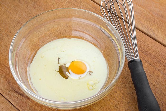Яйцо взбить с молоком и подсолнечным маслом, посолить.