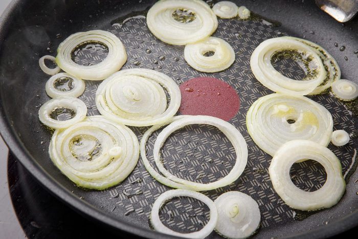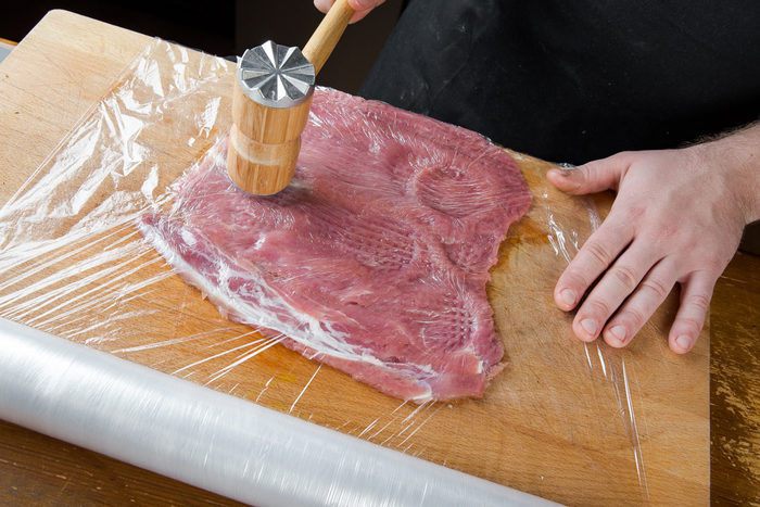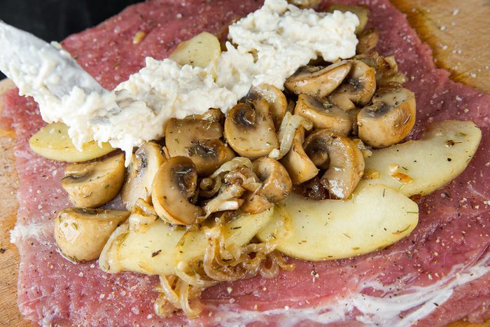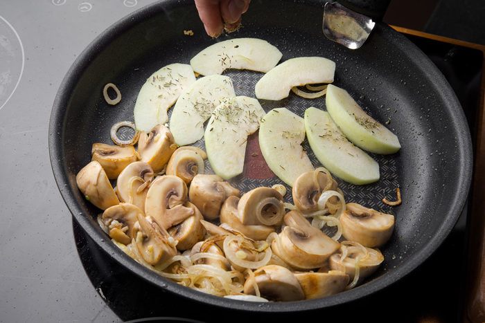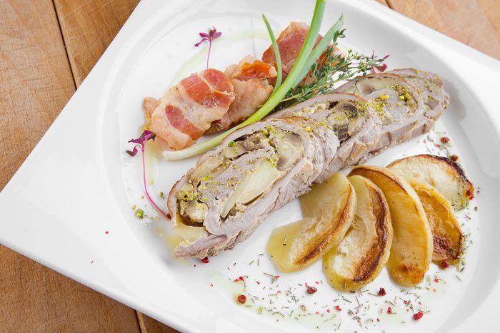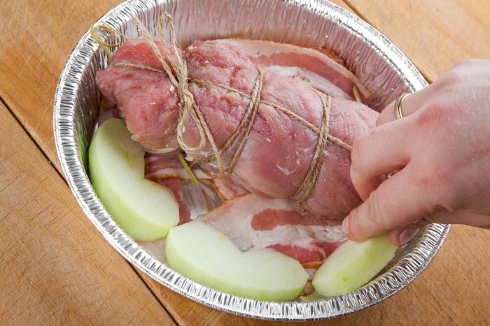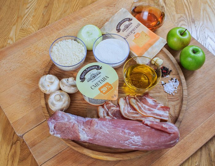 Выкладываем бекон на дно формы, на него сверху кладем рулет, а рядом с рулетом — нарезанные на дольки яблоки. Поливаем блюдо сидром и ставим запекаться на час (может понадобиться чуть больше времени, ориентируйтесь по своей духовке). Разогреваем духовку до 200°С.
