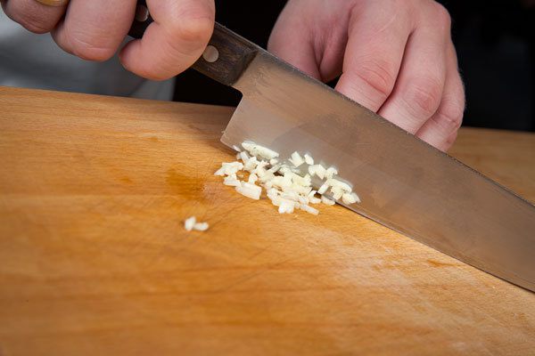 Чеснок почистить, раздавить плоской стороной ножа и мелко порубить.