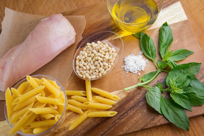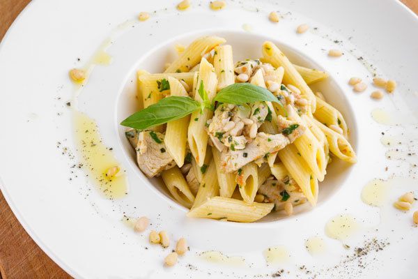 Переложить макароны с курицей и соусом на блюдо, посыпать оставшимися орехами, сбрызнуть оливковым маслом и украсить базиликом.