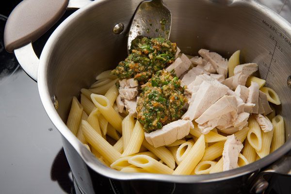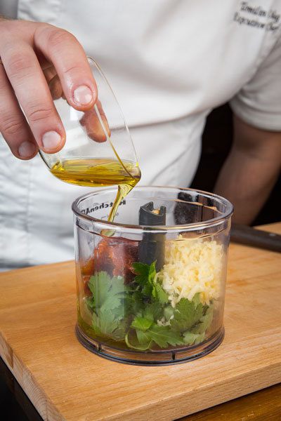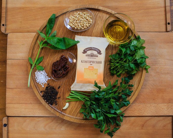 Приготовить соус: базилик, петрушку и кинзу выложить в чашу блендера, добавить вяленые томаты, натертый сыр, чеснок, влить оливковое масло, посолить, поперчить и все взбить. Затем добавить горсть орехов и взбить еще немного.
