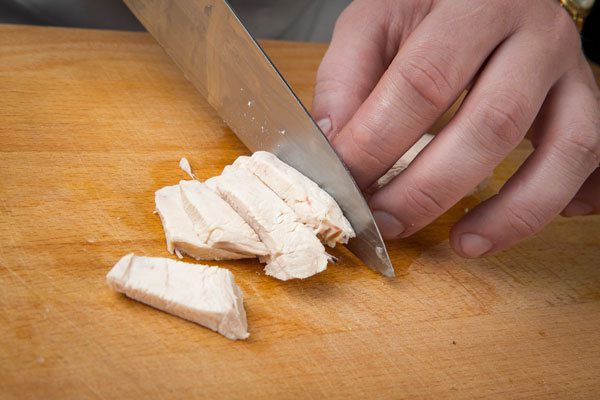 Макароны отварить в подсоленной воде согласно инструкции на упаковке, затем воду слить в емкость и сохранить. К горячим макаронам добавить куриную грудку, 2 ст. ложки соуса, влить немного воды, в которой варились макароны и все перемешать.
