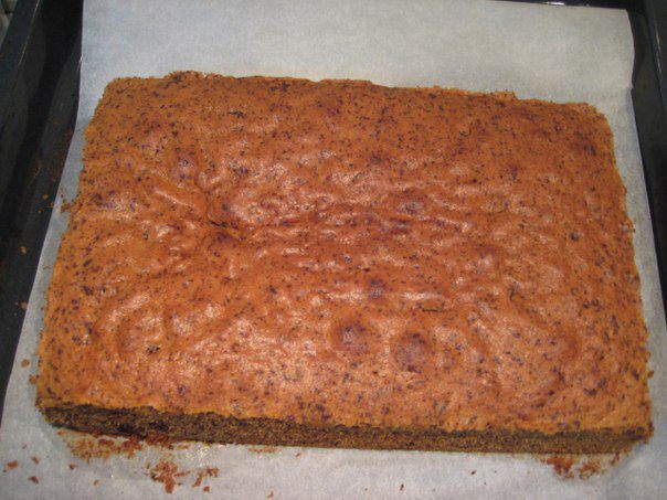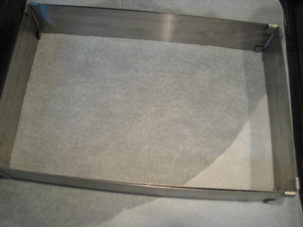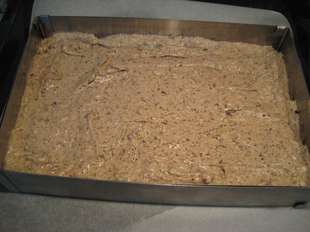Противень застелить бумагой для выпечки, поставить рамку 20х24 см (или выпекать в форме аналогичного размера).