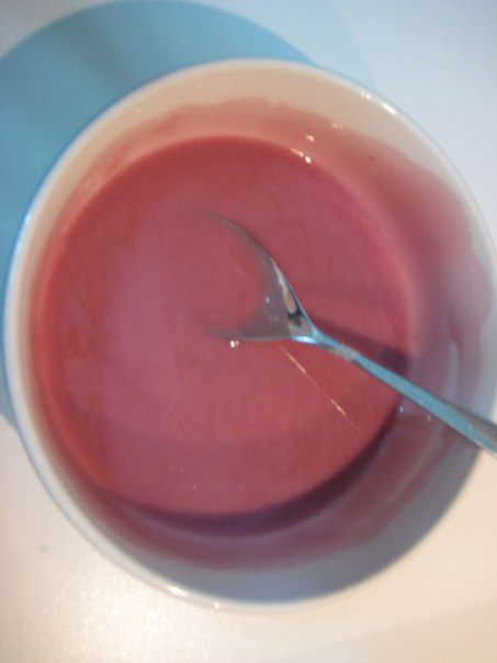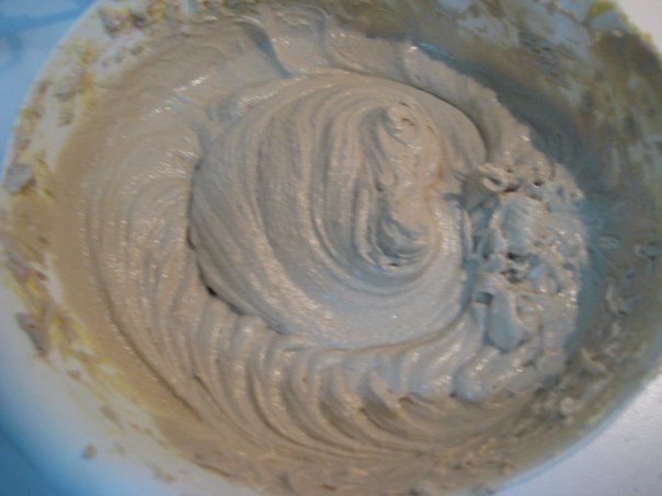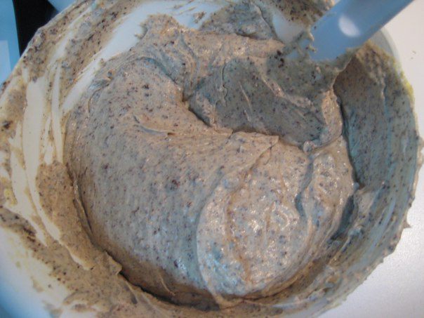 Всыпать муку с разрыхлителем и 125 мл глинтвейна, взбить до однородности. Тесто получается, как густая сметана, грязно-розового цвета.