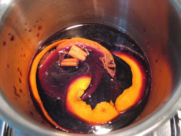 В вино положить специи, цедру апельсина, сахар, нагреть почти до кипения, но не кипятить, накрыть крышкой, дать настояться, остудить, процедить.