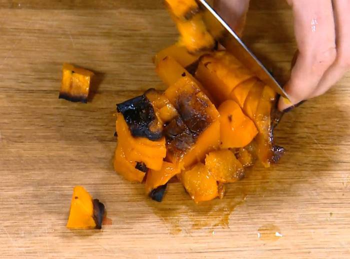 Тыкву запечь в духовке и нарезать небольшими кубиками.