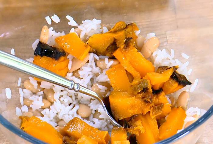 Готовый рис соединить с оставшейся фасолью и тыквой, все перемешать.