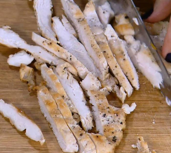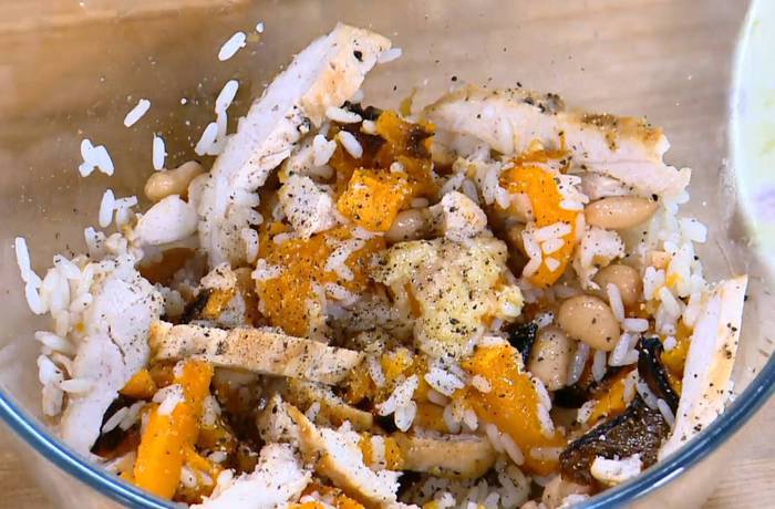 Куриную грудку отбить, слегка посолить, поперчить и обжарить на сковороде-гриль до готовности, затем порезать небольшими брусочками и добавить к фасоли с тыквой.