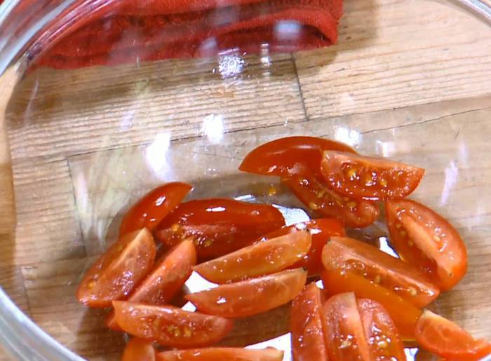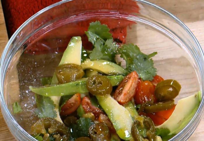 Приготовить соус: помидоры соединить с авокадо, добавить листья кинзы, сок лайма, 2 ст. ложки оливкового масла, нарезанный перец, 2 ст. ложки фасоли, все посолить и перемешать.