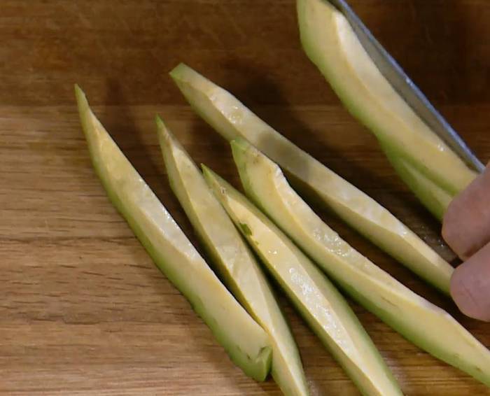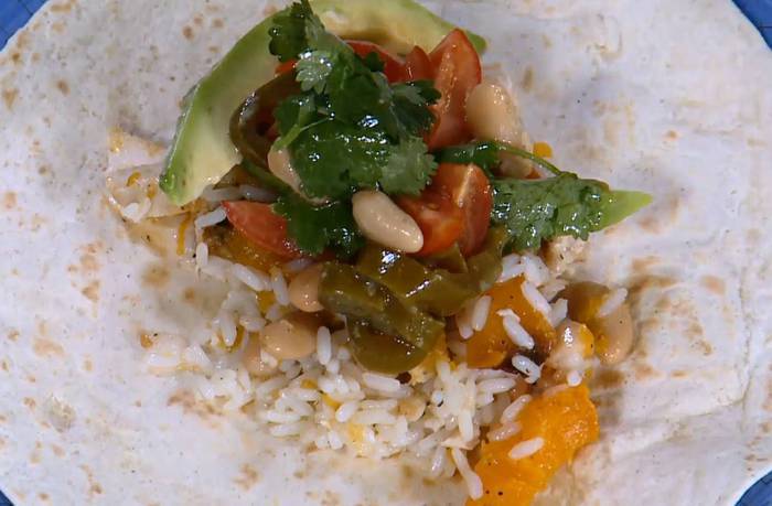 Выложить на лепешки куриную начинку, соус из авокадо и свернуть рулетом.
