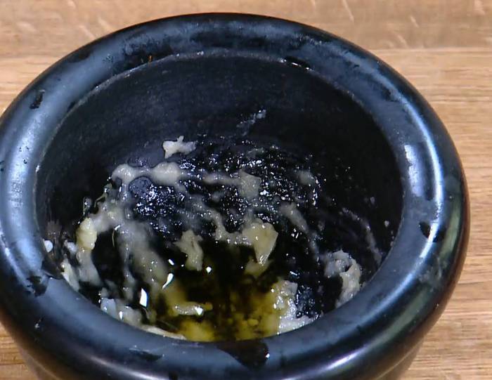 Чеснок со щепоткой соли растереть в ступке, затем влить оставшееся оливковое масло и все перемешать.