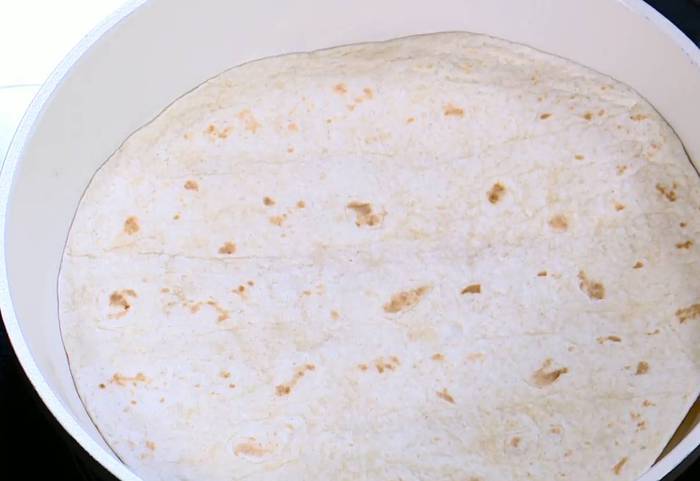 Разогреть сухую сковороду и прогреть лепешки с двух сторон.