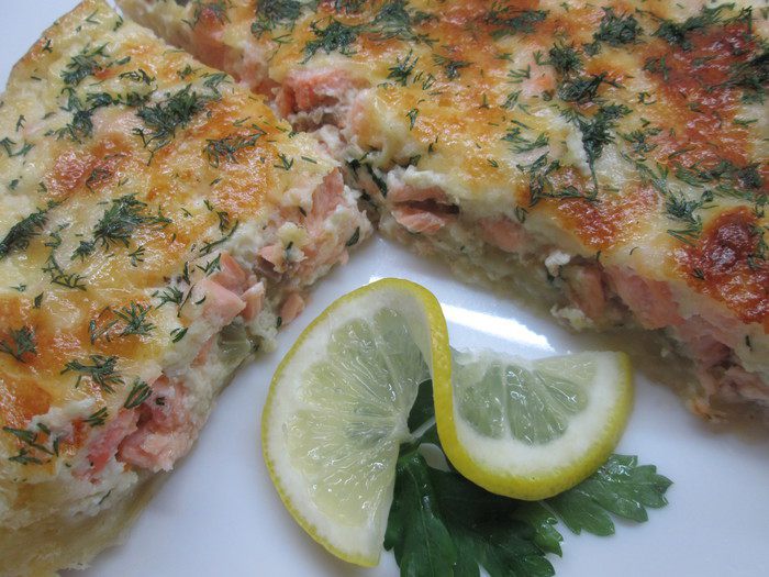 По поверхности теста распределяем весь обжаренный лук и остатки сливочного масла. Сверху выкладываем кусочки филе лосося.