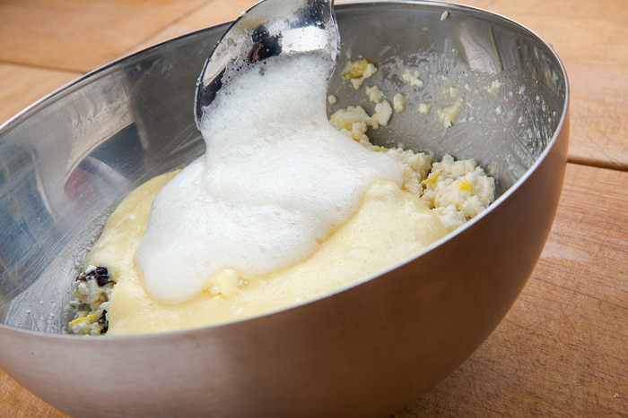 Белки взбиваем до нежной консистенции с лимонным соком. Соединяем с творожной и сырной массой. Все тщательно перемешиваем.