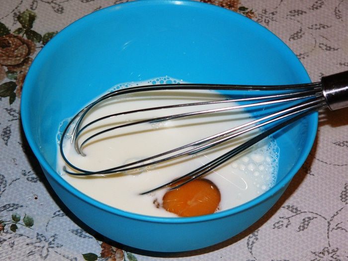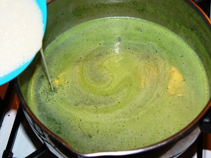 Вернуть кастрюлю с супом на плиту и влить тонкой струйкой молочно-яичную смесь, постоянно помешивая.