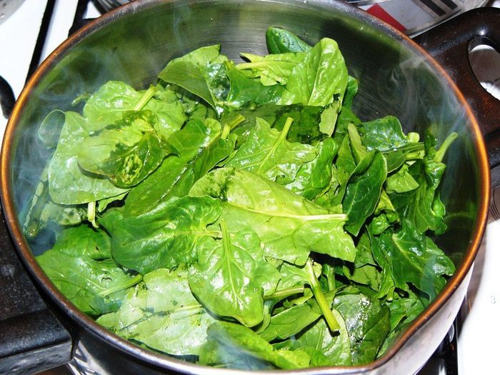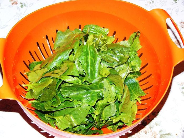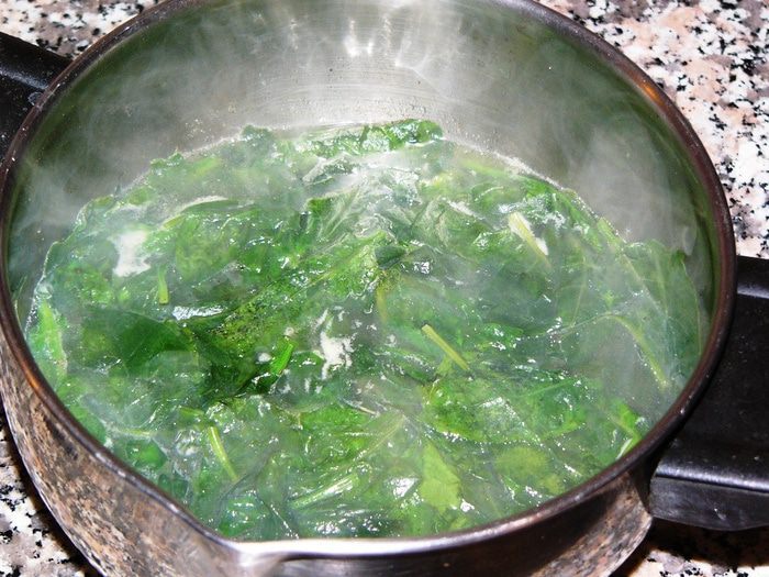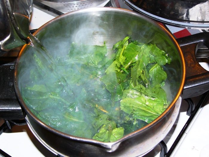 Если шпинат свежий, его надо очень хорошо промыть под проточной водой и оторвать стебельки. У нас рекомендуют подержать зелень хотя бы 10 минут в воде с уксусом. В кислой среде погибают микробы.