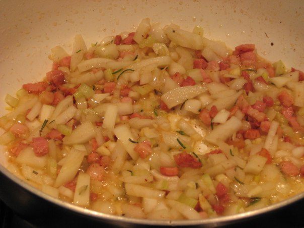 В сковороду, где жарилось мясо, положить бекон, обжарить до прозрачности, всыпать лук, чеснок и измельченный розмарин. Обжарить 2-3 минуты.