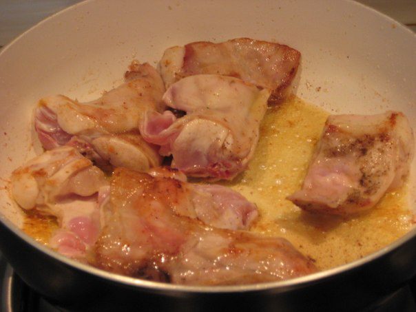 В сковороде растопить сливочное масло, обжарить кролика на сильном огне до румяной корочки с двух сторон. Переложить в жаропрочную посуду.