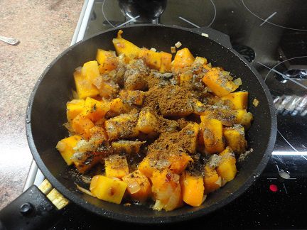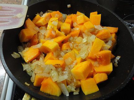 Тыкву добавить к луку и жарить минут 5, не больше.