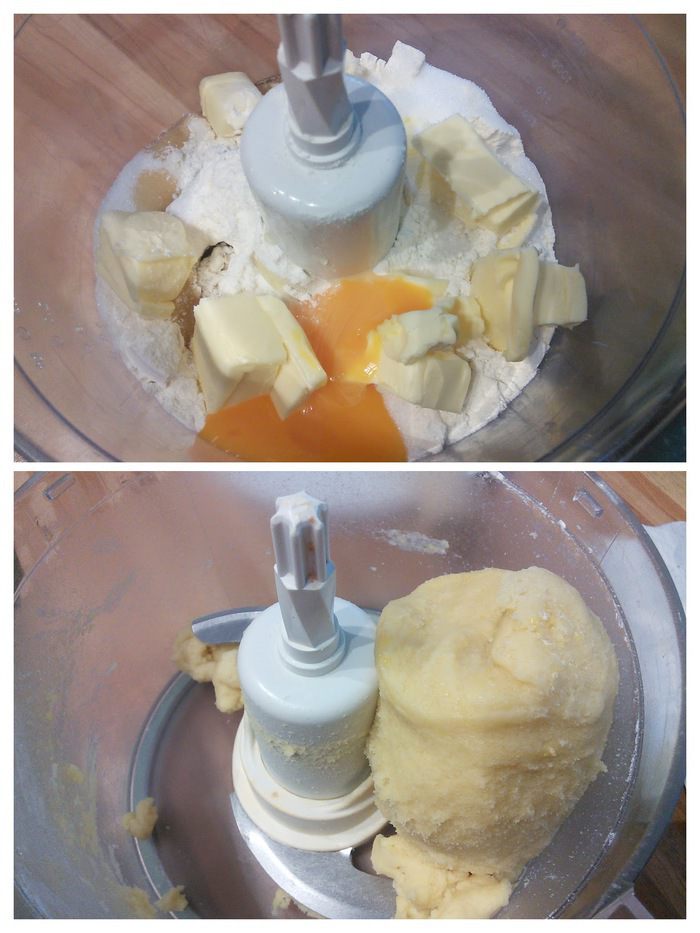 Для песочного теста смешайте муку со щепоткой соли, сахаром, ванильным сахаром, желтком, порезанным на кубики холодным маслом (очень удобно и быстро это делать в блендере) до состояния крошки. Добавьте 1-2 ст. л. ледяной воды, замесите тесто, заверните в плёнку и поместите в холодильник на 30 минут.