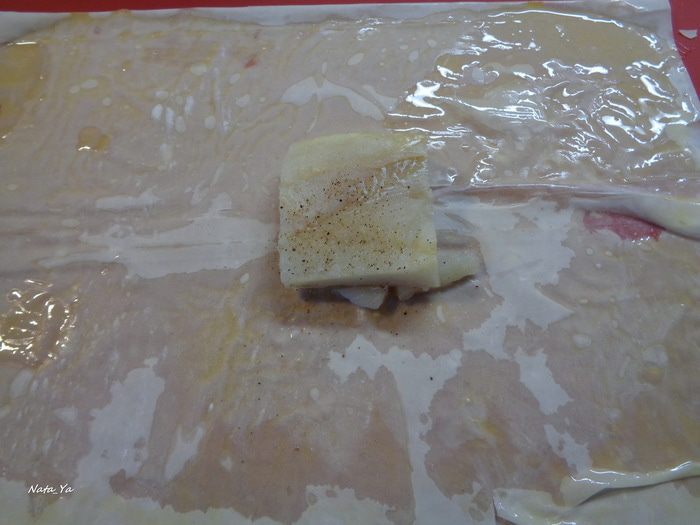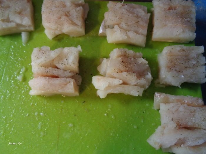 Отрежем 8 кусочков трески, примерно по 3-4 см шириной. Посолим и поперчим.