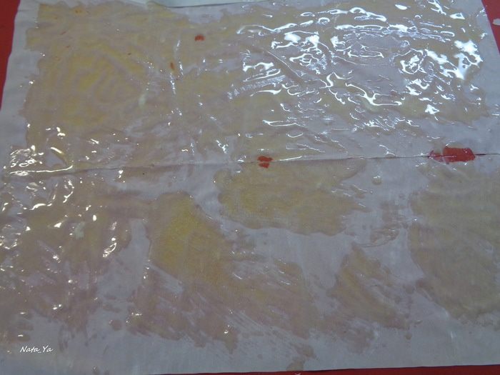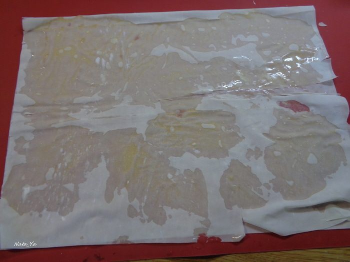 Дальше все просто. Пласт теста фило смажем растопленным сливочным маслом, особо не усердствуя. Главное, пройти хорошо края.