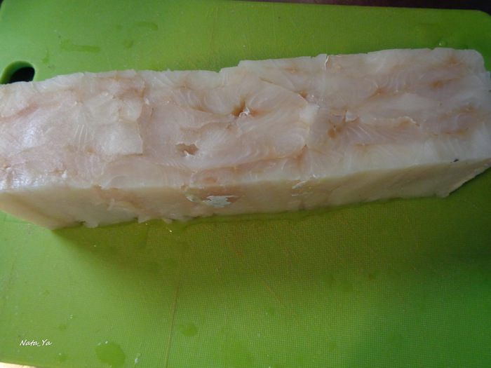 У меня был вот такой кусочек мороженого филе трески. Можно взять свежую треску или любую другую нежирную белую рыбку.