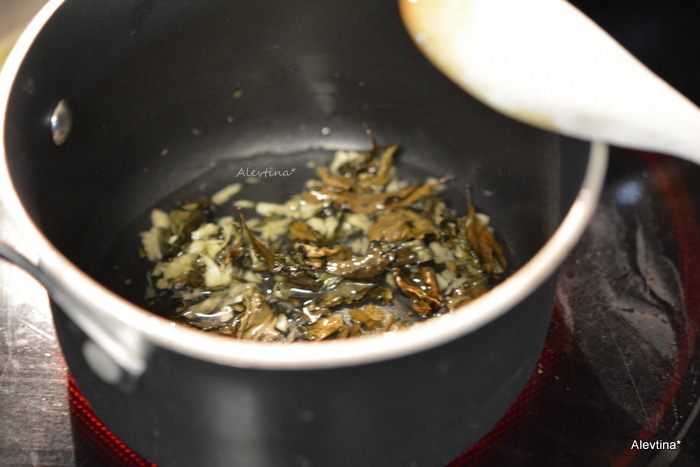 Для заправки по рецепту желательно использовать свежий базилик (листья), я использую сушеный 1/4 стакана. Разогреть масло на медленном огне, добавить листья базилика, чеснок порубленный. Снять с огня как все станет теплым. Базилик свежий убрать, если используете сушеный оставить.