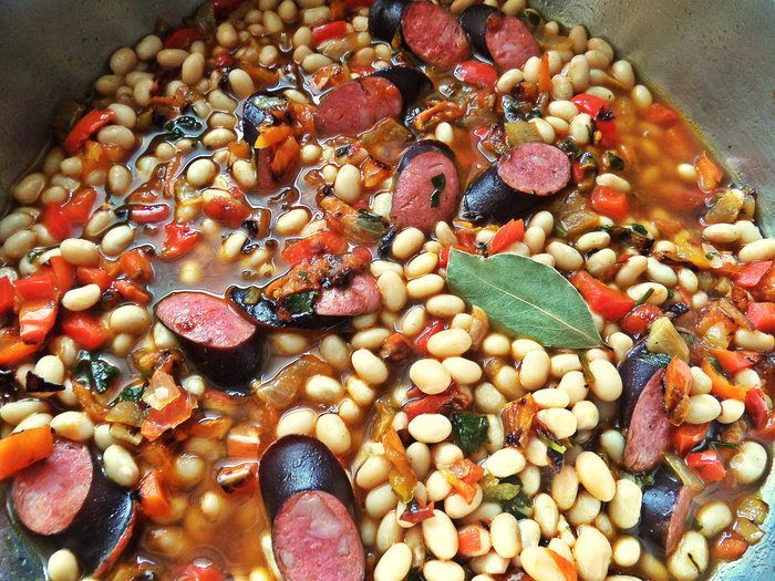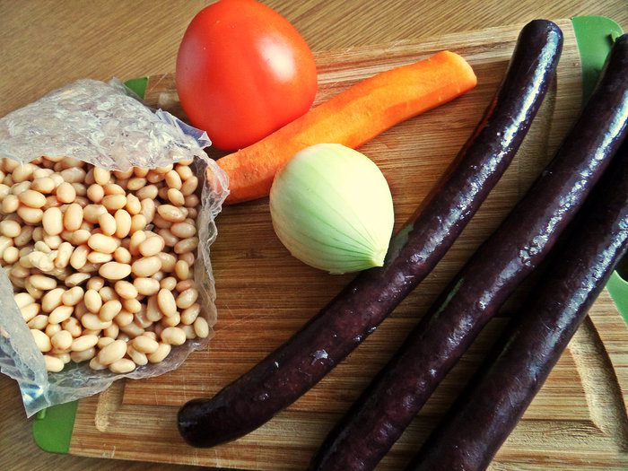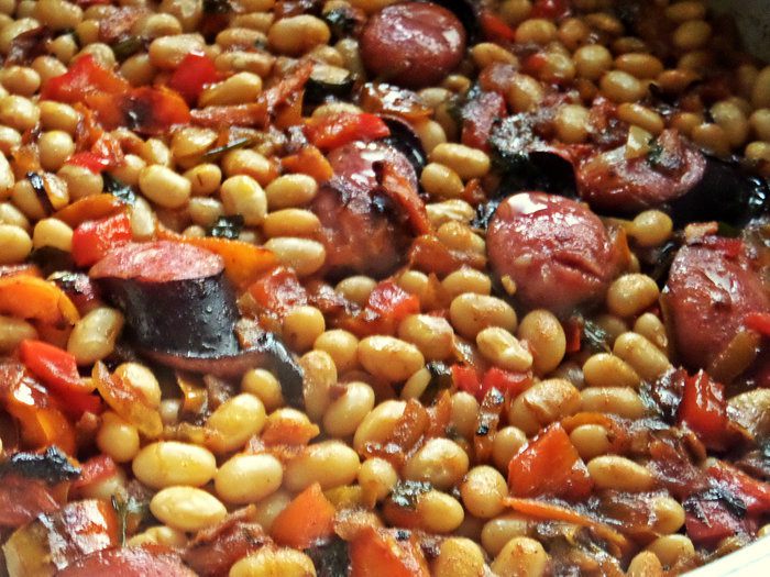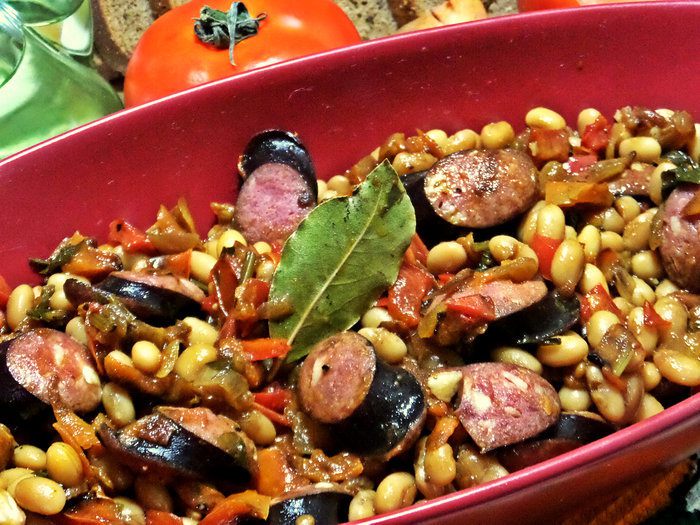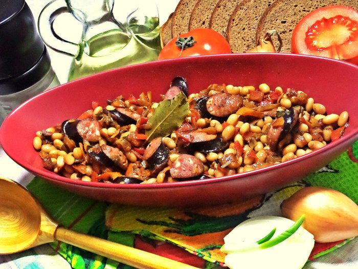 Если всё время и силы в праздники ушли на запекание индейки (кролика, рульки и т.д.), а стол нужно срочно дополнить сытным вкусным блюдом, вас выручит фасоль и колбаски (колбаски я всегда держу парочку в морозилке). Это блюдо займёт не более полчаса!