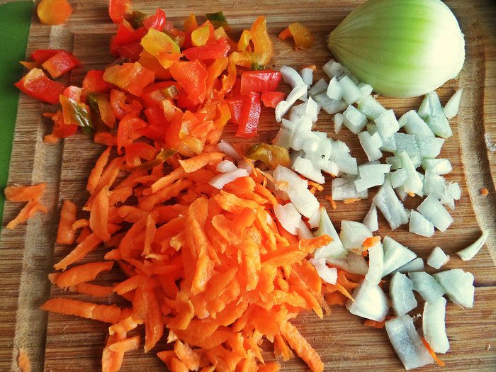 Очистить, натереть и нарезать морковь, перец и лук.