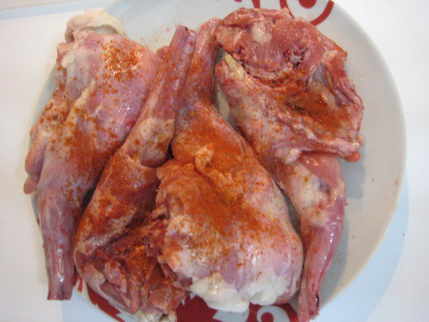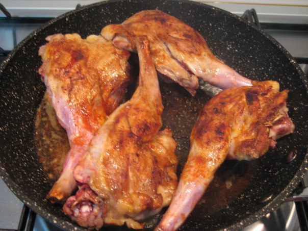На сковороде разогреть сливочное и оливковое масло, на сильном огне обжарить кролика до румяной корочки с двух сторон. Сложить в жаропрочную посуду.