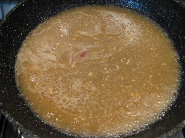 В эту же сковороду влить вино, воду, добавить горчицу, мед, довести до кипения, выключить.