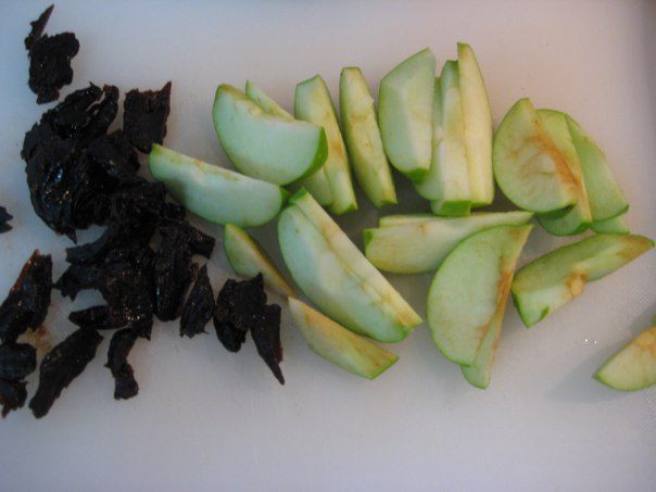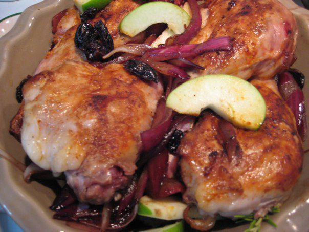 В форму к мясу положить яблоки и чернослив, веточку розмарина, влить жидкость из сковороды, форму накрыть фольгой и запекать при температуре 180°C полчаса, снять фольгу, перевернуть мясо и запекать еще 30 минут до румяного цвета.