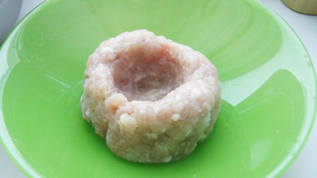 Смоченными в воде руками сделать ямку, в которую будем накладывать начинку.