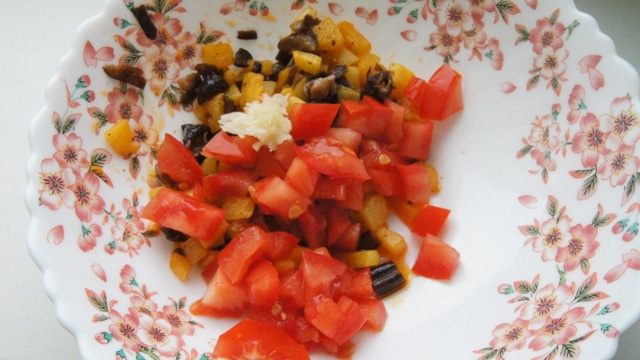 Небольшой помидор нарезать мелкими кубиками и смешать с обжаренным кабачком и грибами. Добавить чеснок, измельченный прессом.