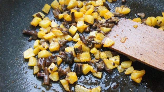 Делаем начинку: кабачок очистить и нарезать мелкими кубиками, грибы маринованные нарезать также. Разогреть растительное масло и обжарить все на среднем огне 5 минут, помешивая.