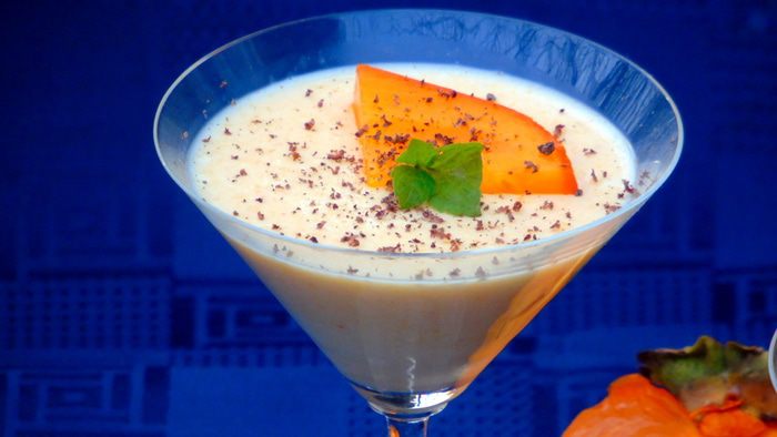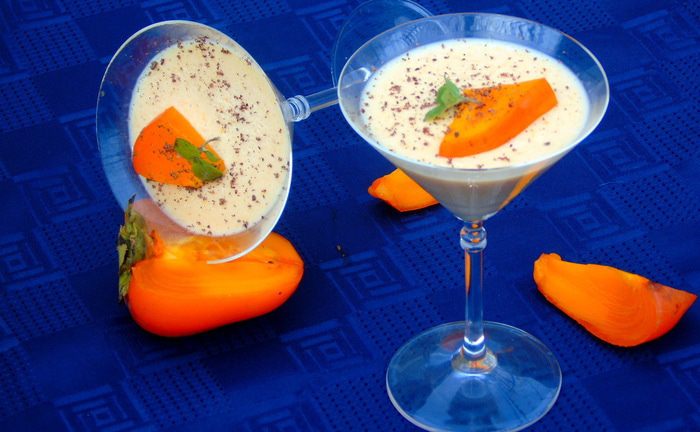 Разливаем по креманкам или бокалам и отправляем в холодильник на 4-5 часов (я отправила на ночь). При подаче, по желанию, присыпаем шоколадом и украшаем кусочком хурмы.