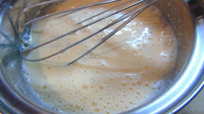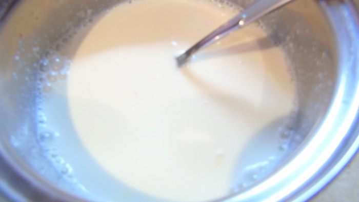 Сливки с сахаром нагреваем, но не даем им закипеть, снимаем с огня и добавляем желатин, перемешиваем и даем остыть до комнатной температуры.