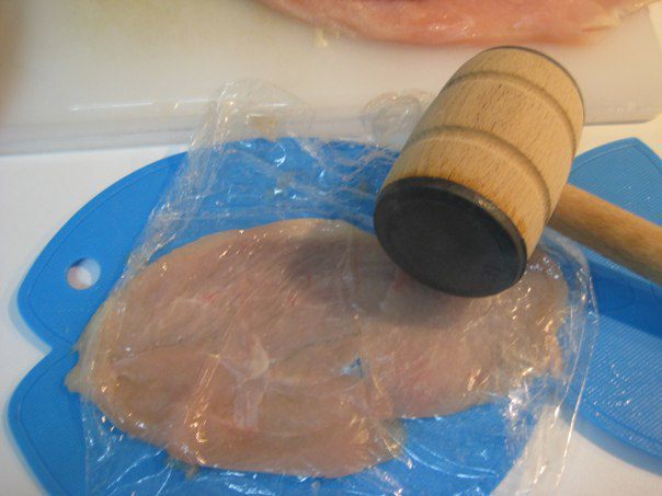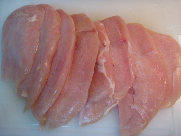 Куриное филе нарезать на тонкие пластинки, удобнее делать, когда немного подморожено.