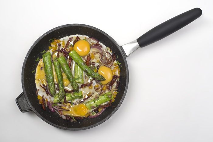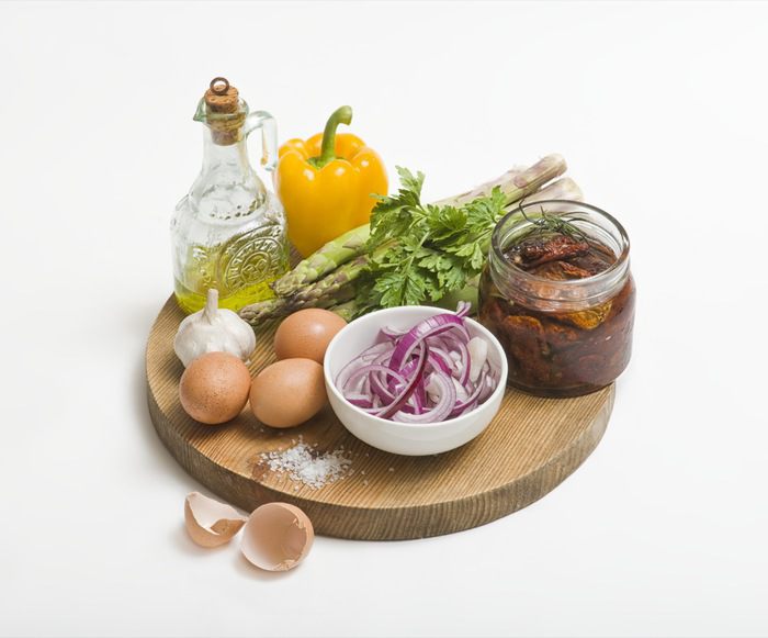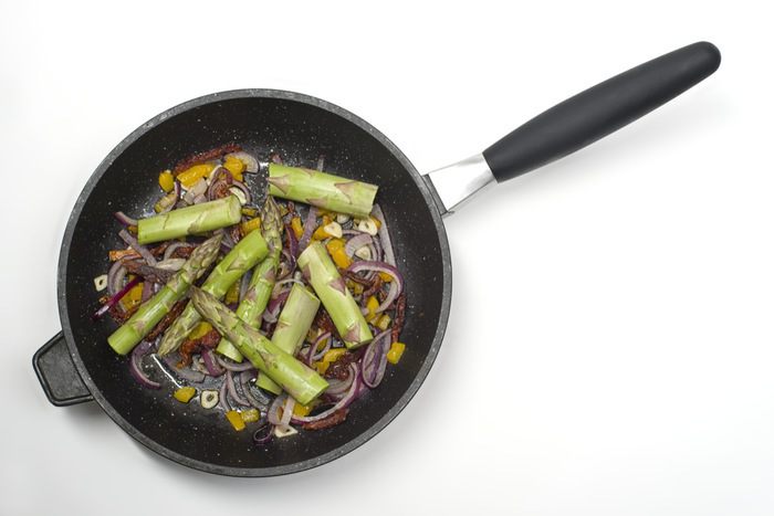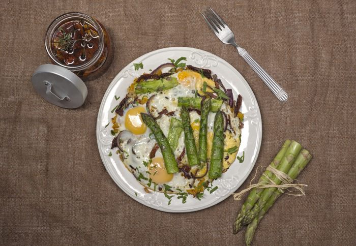 Перец нарезать кубиками, лук нарезать кольцами, чеснок мелко порубить. Вяленые помидоры нарезать вдоль. Спаржу промыть и отрезать грубую часть. Обжарить ингредиенты в следующем порядке: сначала перец, затем добавить помидоры, затем лук и затем чеснок. Обжаривать на среднем огне, постоянно перемешивая.