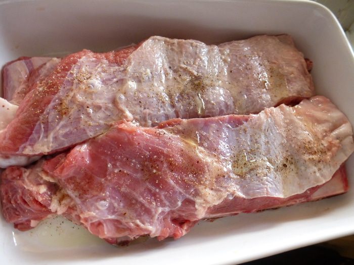 Ребра выкладываем в керамическую форму, в которой их будем готовить. Натираем ребра солью и свежемолотым перцем (у меня смесь из 5 перцев), сбрызгиваем оливковым маслом.