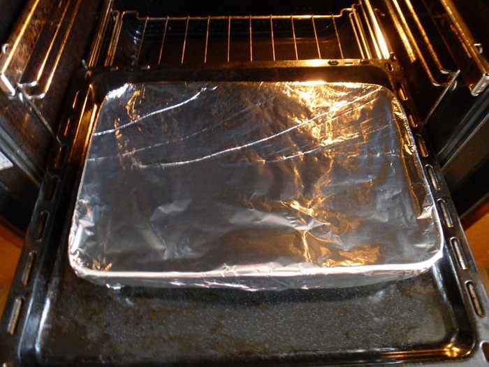 Форму плотно оборачиваем фольгой и ставим в духовку, разогретую до 100 °С, на 8 часов.